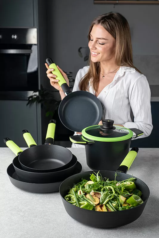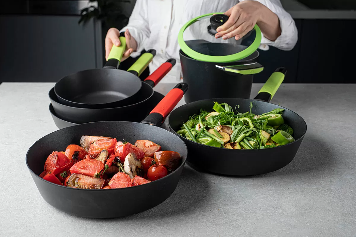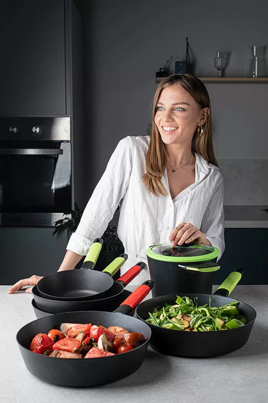 Cъемные карбоновые ручки устойчивы к нагреванию до 240°С. С ними вы никогда не обожжете пальцы, даже если будете крепить ручку прямо в горячей духовке.